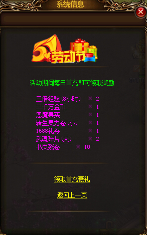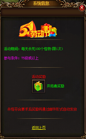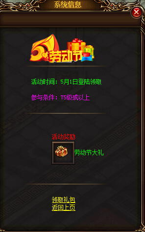 【活动内容】等级75级以上玩家,5月1日当天登陆游戏,可领取劳动节豪华大礼一份;