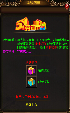 【活动内容】活动期间,等级75级以上玩家每天可在土城树苗处浇水一次,每次浇水树可获得2点成长值,浇水的玩家可获得1个植树奖励;当树木的成长值达到100时,不可继续浇水,此时全服75级以上玩家可在此领取1个成长奖励;每天的24点清零