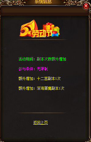 参与方式:玩家可打开右上角【劳动节】图标,或者在赤月皇城148,89【节日使者】处查看活动内容