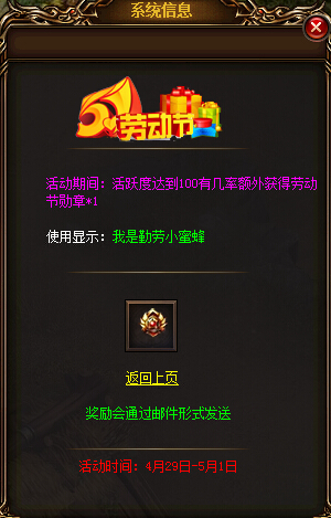 【活动内容】活动期间,活跃度达到100有几率额外获得劳动节勋章
