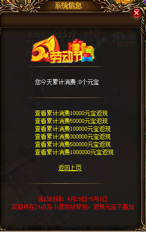 【活动内容】在4月29日-5月1日每日消费到指定金额,24点后小退发放到背包,返现元宝不叠加