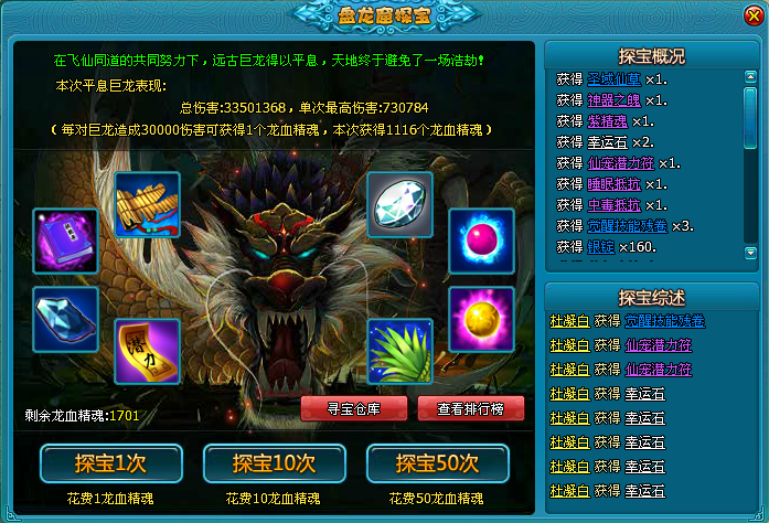 每伤害30000血就可以获得1个龙血精魂(总伤害血量不超过30000将无法获得龙血精魂),在获得龙血精魂后可以在盘龙窟探宝,每次消耗1个龙血精魂,探宝有一定几率获得觉醒技能残卷、抗性技能书、蓝色洗炼石、仙宠潜力符、幸运石、紫晶魂、神器之魄、圣域仙草、银锭等物品。