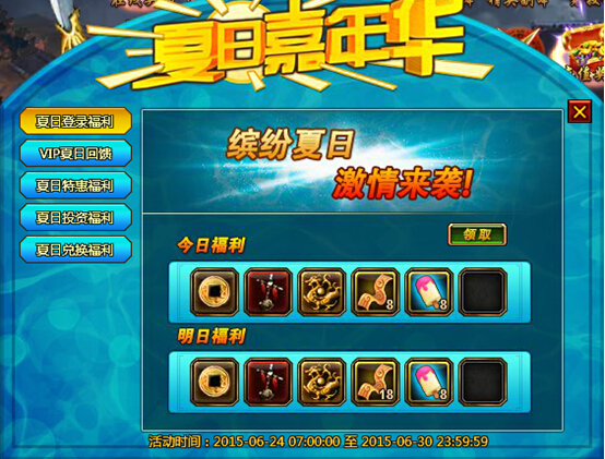 活动内容:在活动期间,每天登录游戏就可以在"夏日嘉年华"界面领取一份福利礼包。