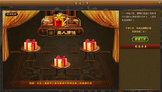 活动内容:在活动时间内,只需消耗88元宝即可宴请三军一次,参加宴请三军的客人越多,富豪最后可以获得的礼包数量越多,最多一次可以获得4个礼包。谁也不要拦我,我就是慷慨的壕,我要宴请!