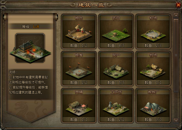 在360uu《大皇帝》的封地系统中,随着玩家们等级的逐渐提升,封地内官邸系统的等级提高,建筑种类也将逐步增加,从前期最基础的农田民户,到后期的铜雀台摘星楼,封地建筑将会是你资源产出最可靠的地方,相比较其他系统与玩法,封地系统每隔一定时间自动产出的设定让你建造之后便可无忧。农田民户等资源为你提供了最有用的资源,校场让你在此培养自己的武将,工匠坊为你的不对打造军械,铜雀台生产英雄碎片,助你早日招募到心仪的神将,在封地系统中,可谓涵盖了360uu《大皇帝》中的方方面面,在这里,所有的野望不在是梦想。