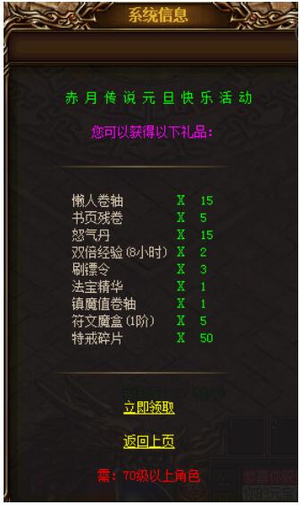 【活动内容】活动期间,活动当天70级以上的玩家可领取以下奖励