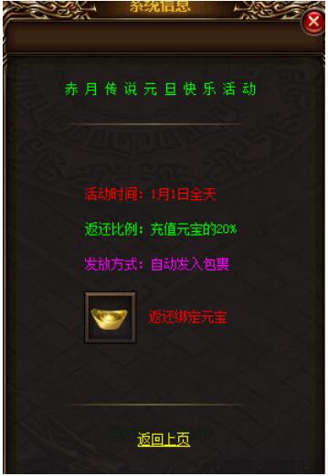 【活动内容】活动期间,活动当天充值元宝返还20%充值元宝的绑定元宝