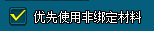 游戏中生产、强化、洗练等等功能面板上都有这个选项,而系统默认是选中的,大家一定要注意把这个选项取消,否则很多可以卖出去的材料却被自己消耗掉了。为了避免这种情况,非常建议大家养成习惯,经常把非绑定的材料放在仓库里。