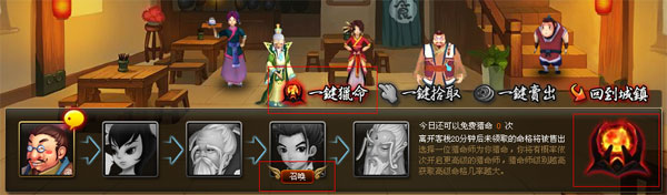 进入客栈便可点击下方一排的猎命师NPC头像进行猎命,VIP5以上增加了一键猎命功能,同时可以使用元宝直接召唤张道陵天师,80%几率会猎到经验命格”太初“拥有1200点命格经验。(用于提高其他命格的等级。)