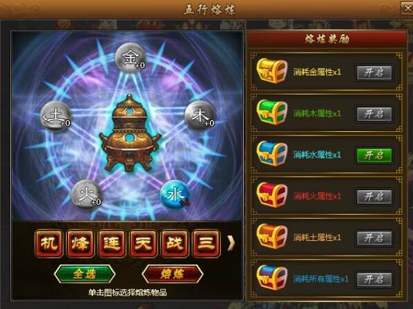 注:字符道具也可进行熔炼,并随机获得五行属性。没有道具也可以使用元宝进行熔炼