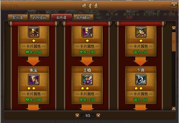 玩家可将武将名卡放入将星录新开放的名将谱中加强角色属性。