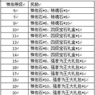 活动规则:活动期间,将任意装备神佑提升到指定等级,可获得额外系统赠礼。