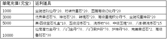 活动期间,所有玩家首次充值任意金额,即可获得价值1088元宝的首充奖励:中级星魂积分丹*1、灵幻石*2、鉴宝符*2、四级淬炼石*1、坐骑进阶仙丹*3、时装升星石*2、海芋百合*1(奖励每人只能领取一次,未进行过首充的玩家还可额外获得【首充礼盒】哦)。