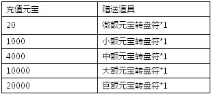 活动期间,玩家充值至指定额度,即可获得对应的元宝转盘符,使用元宝转盘符转动转盘,将可随机获得转盘上任意额度的元宝奖励。每个额度转盘只能转一次,每一轮转完之后将开启下一轮转盘。元宝转盘升级后,最高可累计获得30520非绑定元宝返利哦!