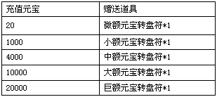 活动期间,玩家充值至指定额度,即可获得对应的元宝转盘符,使用元宝转盘符转动转盘,将可随机获得转盘上任意额度的元宝奖励。每个额度转盘只能转一次,每一轮转完之后将开启下一轮转盘。元宝转盘升级后,最高可累计获得30520非绑定元宝返利哦!
