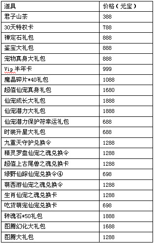 活动期间,所有玩家首次充值任意金额,即可获得价值1088元宝的首充奖励:中级星魂积分丹*1、灵幻石*2、鉴宝符*2、四级淬炼石*1、坐骑进阶仙丹*3、时装升星石*2、海芋百合*1(奖励每人只能领取一次,未进行过首充的玩家还可额外获得【首充礼盒】哦)