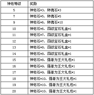 活动规则:活动期间,将任意装备神佑提升到指定等级,可获得额外系统赠礼。