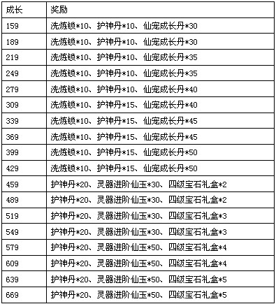 活动规则:活动期间,将仙宠提升至指定成长可获得额外奖励。