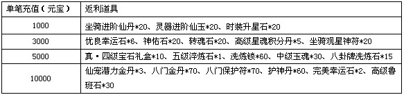 活动期间,所有玩家首次充值任意金额,即可获得价值1088元宝的首充奖励:中级星魂积分丹*1、灵幻石*2、鉴宝符*2、四级淬炼石*1、玄武仙玉*3、灵器进阶仙玉*2、海芋百合*1(奖励每人只能领取一次,未进行过首充的玩家还可额外获得【首充礼盒】哦)。