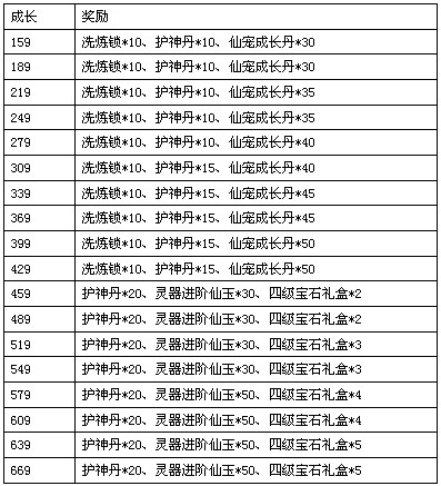 活动规则:活动期间,将仙宠提升至指定成长可获得额外奖励。