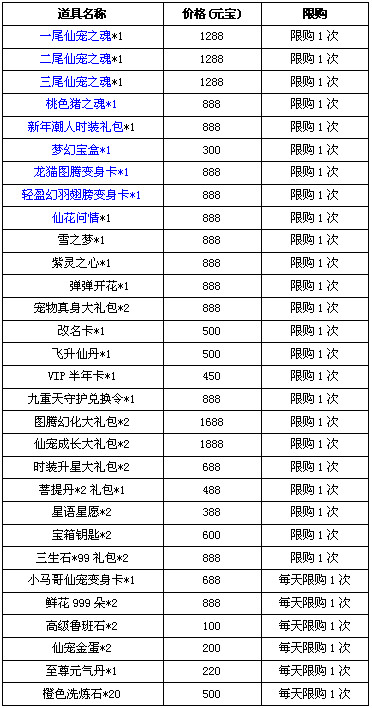 【活动内容】活动期间,玩家可以超值价格购买以下珍贵道具,数量有限,勿错失良机。