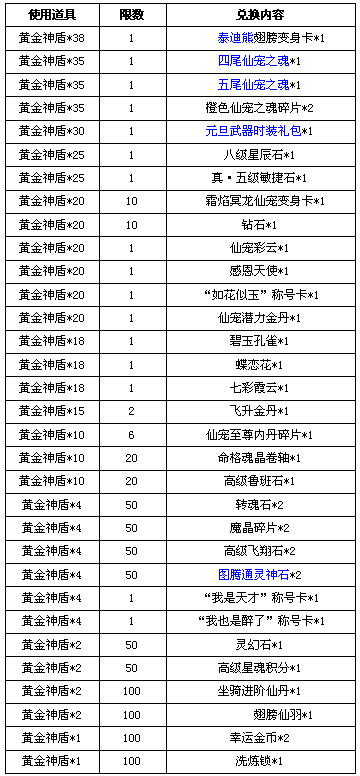 【活动内容】活动期间,使用一定数量的黄金神盾可兑换以下奖励。