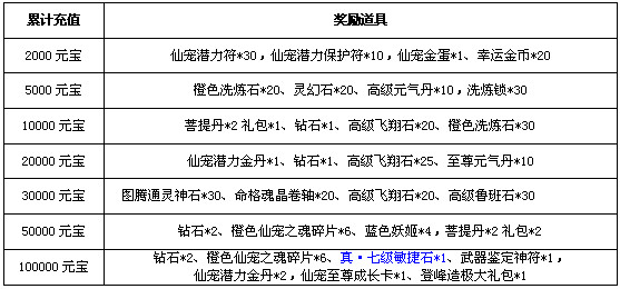 【活动内容】活动期间,累计充值到达一定元宝即可获得对应档次的奖励,每档奖励只可获得一次。