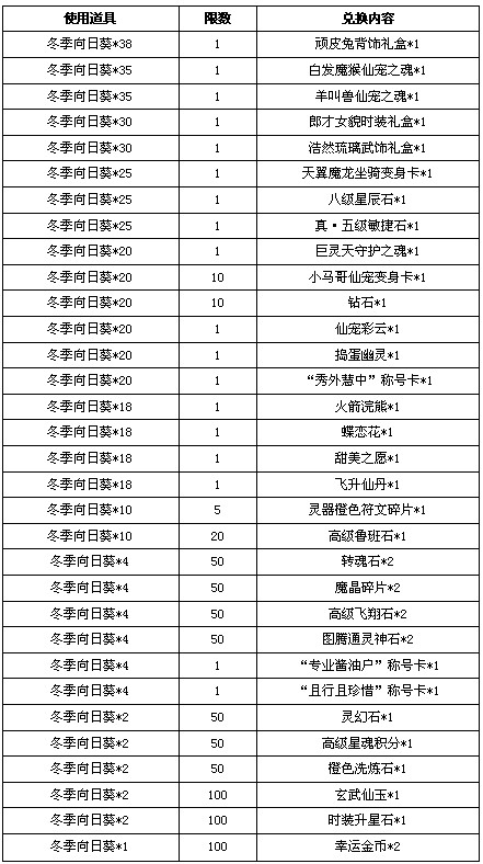 【活动内容】活动期间,使用一定数量的冬季向日葵可兑换以下奖励。