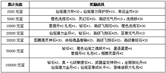 温馨提示:活动期间累计充值元宝达到对应条件,奖励由邮件发放,请注意领取。