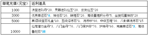 活动期间,所有玩家首次充值任意金额,即可获得价值1888元宝的首充奖励:高级星魂积分丹*1、灵幻石*2、鉴宝符*4、四级淬炼石*1、玄武仙玉*6、灵器进阶仙玉*6、海芋百合*1(奖励每人只能领取一次,未进行过首充的玩家还可额外获得【首充礼盒】哦)。