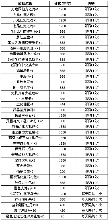 【活动内容】活动期间,玩家可以超值价格购买以下珍贵道具,数量有限,勿错失良机。
