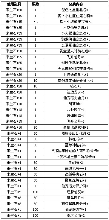 【活动内容】活动期间,使用一定数量的来生石可兑换以下奖励。