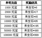 【活动内容】活动期间,单笔充值一定数量以上的元宝即可获得对应档次的奖励,每档奖励获得次数不限。