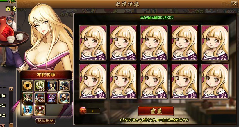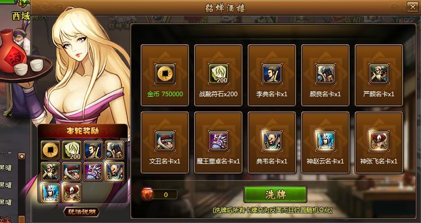 玩家点击卡牌花费元宝和道具小酒坛进行翻牌。