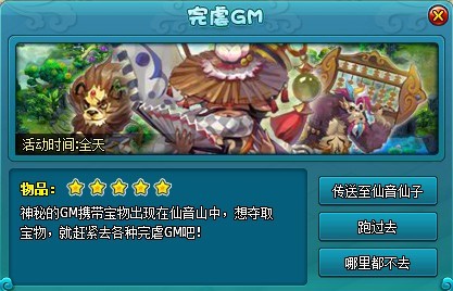 活动开始,会出现“完虐GM”活动图标,点击打开活动界面,通过NPC-仙音仙子进入组队大厅,最多3人进入仙音山(友情建议组队进入)