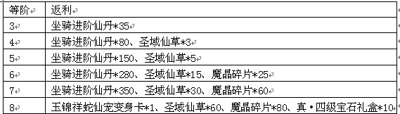 活动规则:活动期间,将坐骑进阶至指定阶数,可获得额外系统赠礼。
