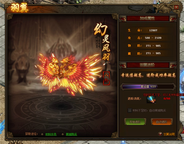 等级到达60级时,在主界面点击羽翼按钮进入系统界面: