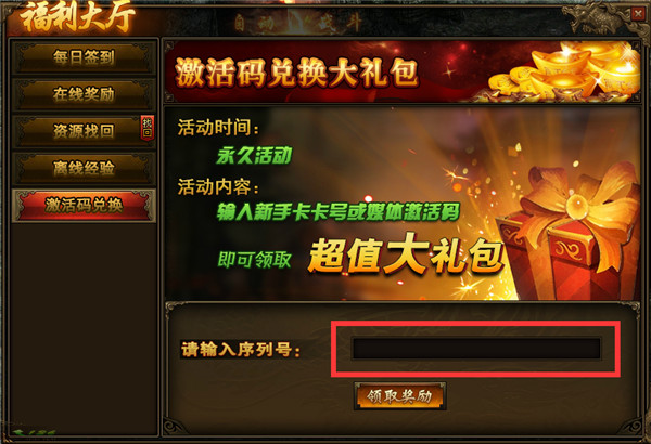3、在福利大厅的左侧选择“激活码兑换”,并输入卡号激活领取