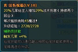 ②法伤祝福:x%几率给主人增加y%法术伤害,持续两个回合(技能阶数和等级越高,效果越好)。