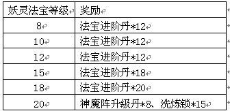 活动规则:活动期间,将灵戒洞天里任意妖灵法宝等级提升到指定等级,可获得额外系统赠礼。