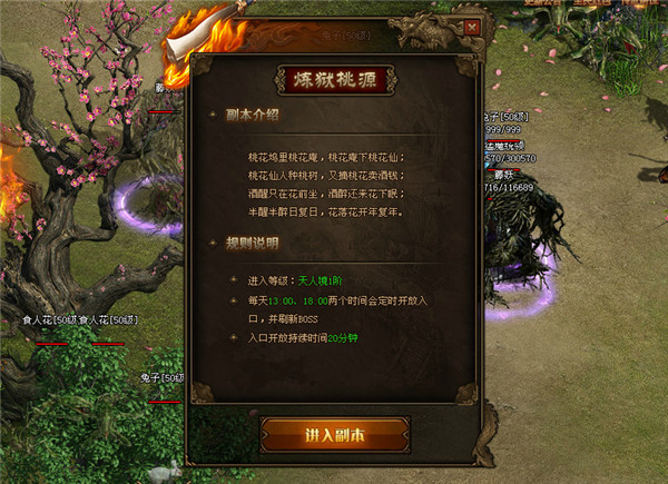 炼狱桃园开启,等待勇者来战!在360uu《传奇世界》网页版全新开启的炼狱桃园位于游戏内的神魔边寨,玩家每天下午13点和18点都可以前往对话挑战,当然,桃园内危机四伏险象环生,没有到达天人境1阶的玩家将被拒之门外,入口将向玩家开放20分钟,规定时间内未进入将无法进入。在桃园中将有八位实力强劲的BOSS等待着玩家抢夺战斗,高级装备等待你来争夺,加入炼狱桃园,在这个神秘的桃花坞里迎接全新的冒险与挑战!