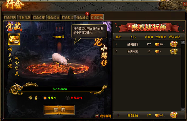 使用食材喂养灵宠可获得喂养值,值满后,会发放1000元宝的行会大红包