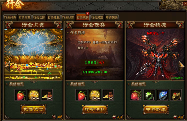玩家每天可完成10次行会任务,任务次数每天零点刷新