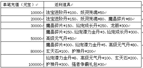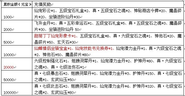 活动期间,所有玩家首次充值任意金额,即可获得价值1088元宝的首充奖励:20元宝抵用券*1、灵幻石*2、玄武灵玉*5、龙筋*5、魔晶碎片*3、坐骑进阶仙丹*3、花蝶密语*1。(奖励每人只能领取一次,未进行过首充的玩家还可额外获得【首充礼盒】哦)。