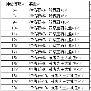 活动规则:活动期间,将任意装备神佑提升到指定等级,可获得额外系统赠礼。