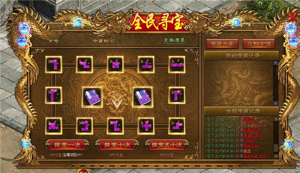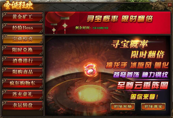 1、活动期间,玩家寻宝概率翻倍,极高几率获得仙元石,苍穹套装,特戒钢纹,超级技能书-擒龙手、冰旋风、兽化,以及高等级八阵图-至尊云垂阵;