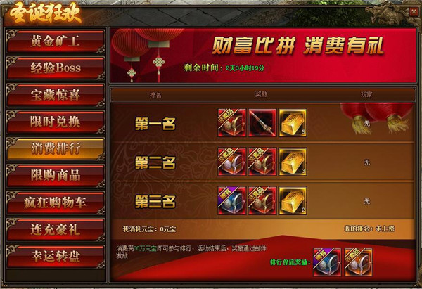1、活动期间,玩家消费满30万元宝参与排行