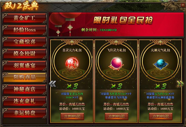 1、活动期间,玩家可在活动面板购买限购商品;(可翻页)