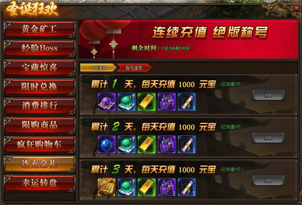 1、活动期间,每天充值10元,100元可领取相应奖励。