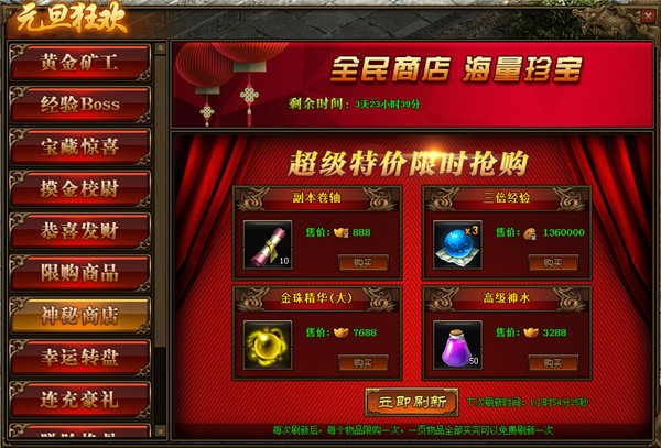 1、活动期间,玩家可在神秘商店中购买商品,商品可用金币,绑元,元宝进行购买;
